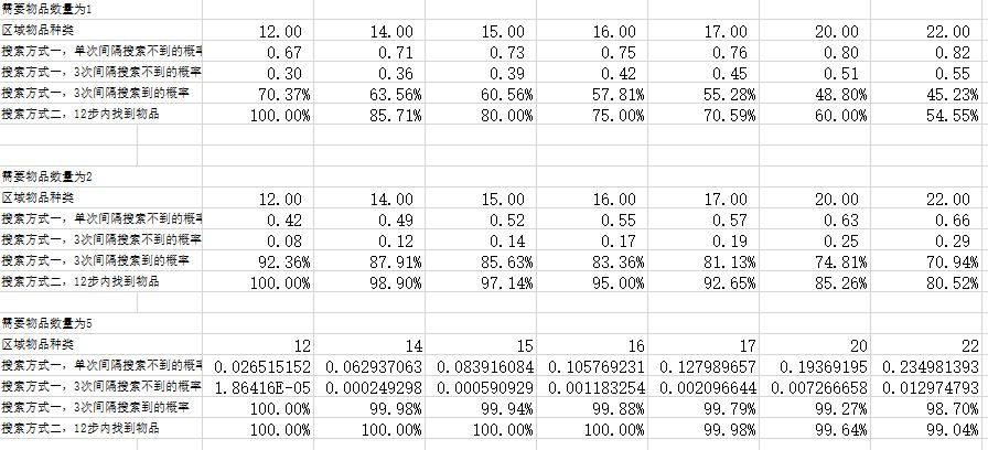 条件:我在某个区域只需要N(N取1,2,5)种物品,其他的都不需要。搜索方式:1:改变顺序的次数为3,改变间隔之间的步数取4(由上一个结论得出4是一个比较合理的值);2:不改变顺序硬着头皮走12步。选取区域:全部区域