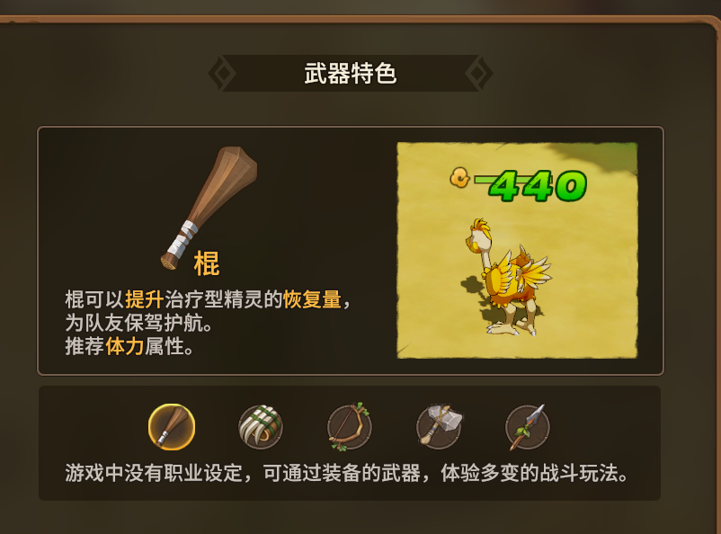 接下来我为大家介绍一下,武器特色和等级品质介绍:棍可以提升治疗型精灵的恢复量,为队友保驾护航。装备右下角数字越大等级越高,属性越好。