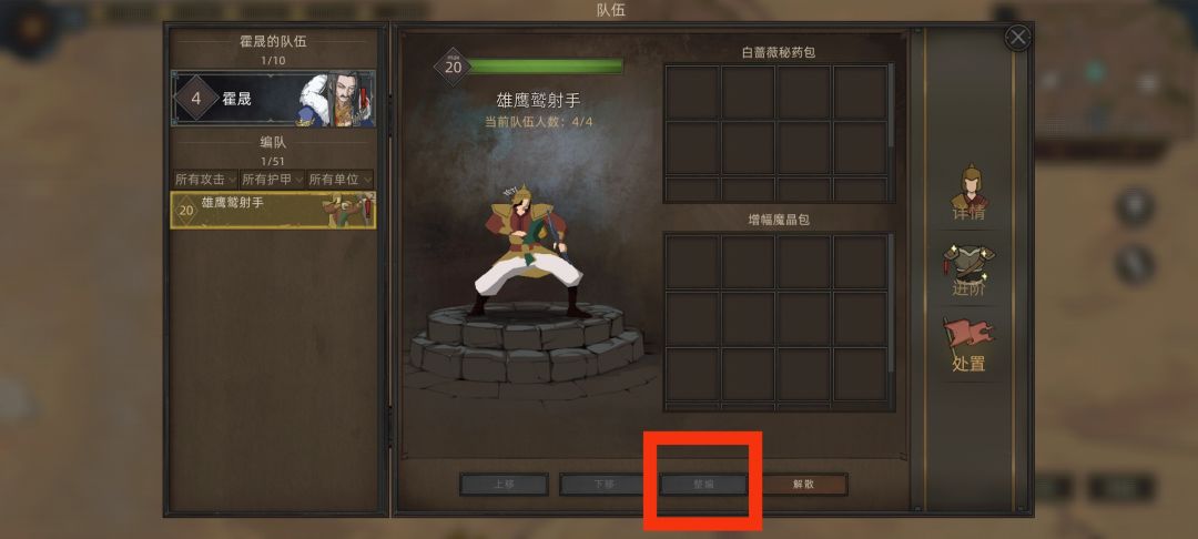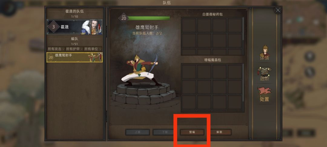 4、把第二个卡牌升阶到第一个同样名字的等阶,点击处置,整编按钮然后把他们合并为一个队伍