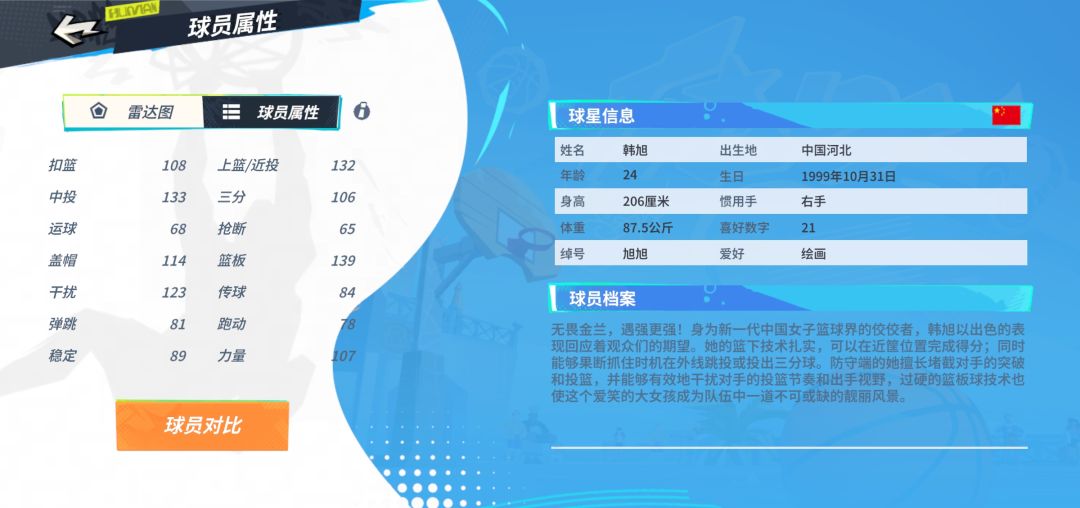 韩旭升满加潜能加衣服三分106,天赋加6%三分命中,一能量空位三分百分百中,威金斯一突以后潜能加衣服三分能到120(目前我潜能还差一点没满),而且空位三分是加10%命中率的,但是并不是百分百命中,属于神经刀准的时候百分百中,铁的时候连续两个空位不中然后只敢接球突进去扣了