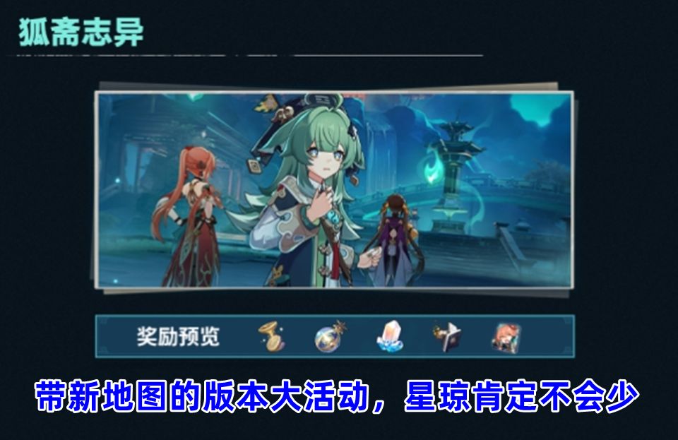 活动部分:除去两个双倍活动,1.5总共有3个带星琼奖励的活动。按照惯例,上半会安排版本主活动,也就是1.5前瞻里重点介绍的“狐斋志异”。因为是伴随新地图的大活动,所以奖励应该会分常驻和限时两部分,总奖励肯定也不少,猜测在2250星琼左右。
