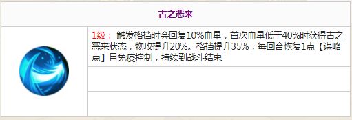④首次降低生命至40%以下时候,典韦除了攻击和格挡的提升外,还能够在接下来的回合内免疫控制以及每回合回蓝+1,所以在一些手动操作的战斗中,可以让典韦先卖血触发“古之恶来”buff后,再着重治疗续航,让其作用最大化