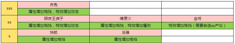 名驹选择建议:同理珍宝选择一样,尽量选格挡属性的物理宝物,如:sss(赤兔),ss(照夜玉狮子,燎原火,金埒),s(快航,乌骓)