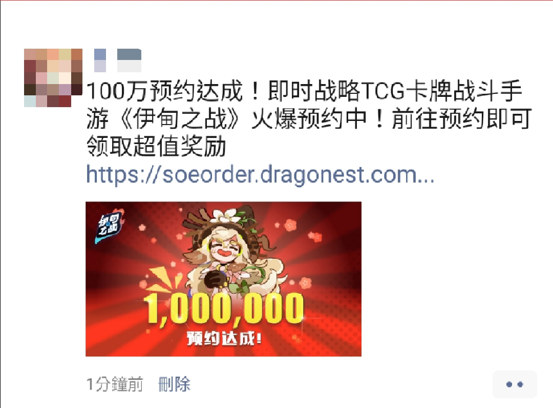 分享文案:100万预约达成!即时战略TCG卡牌战斗手游《伊甸之战》火爆预约中!前往预约即可领取超值奖励 https://soeorder.dragonest.com/#/