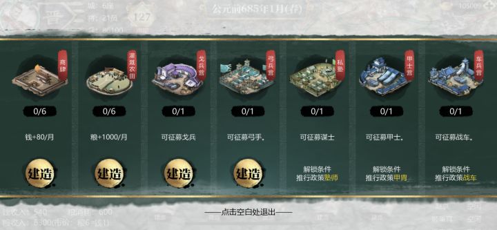 五、兵种及建筑选择:自己每个初始城池尽快建立一个车兵营和一个戈兵营,还有至少一个商肆和一个农田(保证中期买兵的花销),兵种就是战车或者搭配戈兵即可,戈兵尽快升到精戈兵,一般等你一个半小时后出击时候,敌方大部分已经建立了吴国巨戟营,你直接占领后换兵即可。只有部分朝代(如吴国,晋国)可以直接主动升级到鱼丽车阵和吴国巨戟。"内政"高武将的建设用时快。总结一句话,普通战车和精戈兵战斗足够。升级什么巨戟什么鱼丽的属于锦上添花,中途换不换兵全看玩家个人喜好。