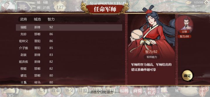 二、一开始先新定个军师,智力高的就行,系统默认的一般不是最高的。可以适当登庸一个智力高的武将进行替换,如孙武、孙叔傲,庄姜。