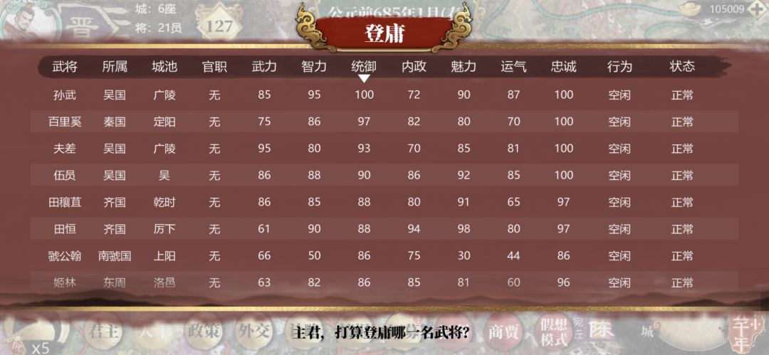 六、登庸:重点来了,我先说一下登庸的原理,就是整个地图上所有的敌方武将全都可以登庸(说服)过来,除了每个敌方国家的君主(每个国家就一个君主)。如果你登庸了所有的敌方武将,这就造成了敌方城池除了君主所在的城池,其他城都没有守备,全都是空城,后期你的占领时间就会大幅缩短。先登庸谁后登庸谁,有一些小技巧,会省一些时间。先登庸"魅力"高的,这些魅力高的会提升你登庸武将的概率,还有同盟概率也会增加,比如夏姬、田恒、诸稽郢、仲由等;再登庸几个"智力"和"内政"高的,方便建设;最后登庸"武力"高和"统御"高的武将,"武力"高除了战斗外,还可以巡视城池,大幅提高城池的治安值,如果治安值极低,甚至出现了民乱,会有较大几率降低你的驻扎兵,"武力"高的武将如夫差、伍员、专诸、田穰苴等,都是你需要准备做主力的;"统御"高的加"士气"高,保证你在对外扩张时能及时补充士气,如孙武、百里奚、田恒、田穰苴、姬林等。反正上百的武将你都要登庸过来,提前看好哪些武将的数值,提前编组→调度好他们的出击城池,为战斗做好准备。