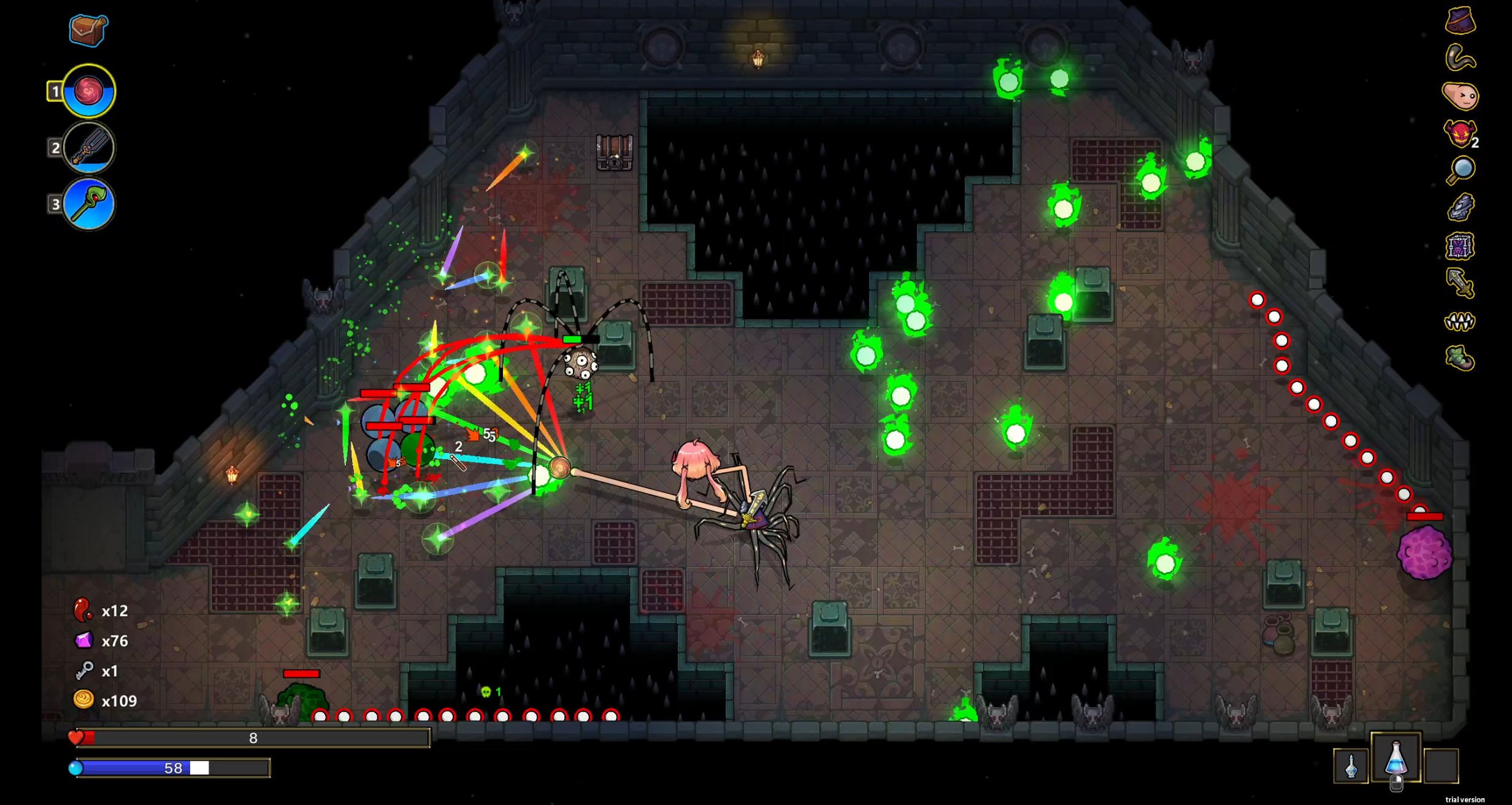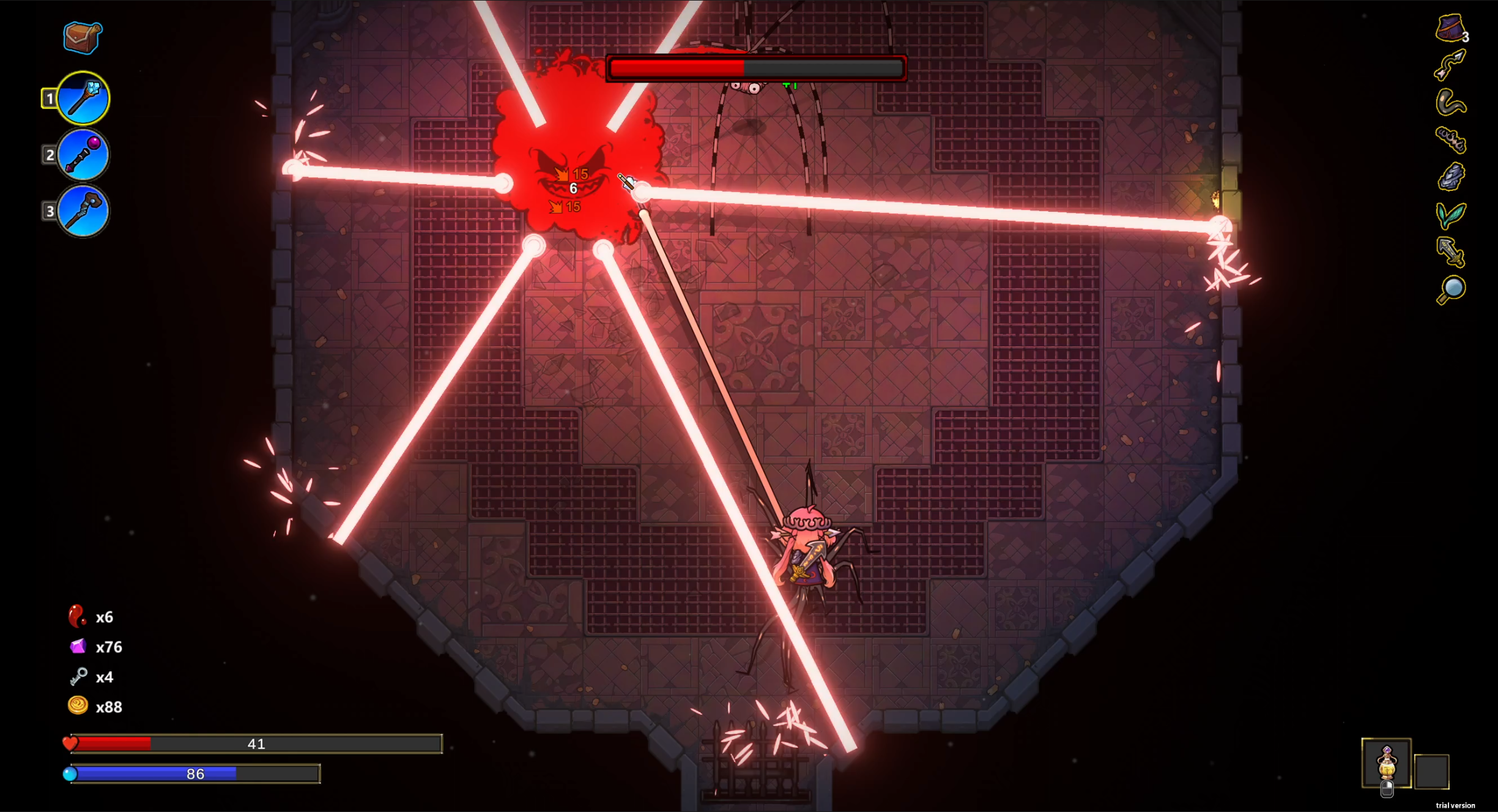法术也是真的很难升级,我把重新随机法术的机器耐久升到最高,也经常刷不出我想要的法术。以及,怪物和子弹,包括人物的法术到后期都会变得眼花缭乱,这时,角色自己的位置和法杖末端的位置就很不显眼。我在录这款游戏的实况时,从第三章的图开始,就经常再说“我在哪里,我的法杖在哪里,哪里啊!我看不到啊!”