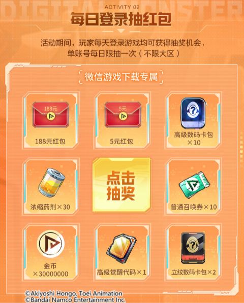 活动规则:活动期间,幸运玩家登录游戏即可领取微信专属豪礼!此外,幸运玩家每日登录游戏可抽奖,单账号每日限抽1次。红包数量有限,先到先得~