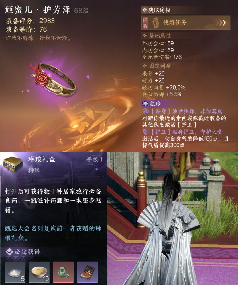 “姬蜜儿护芳泽”可以让佩戴者降低自身气盾并对最近的素问或同样的佩戴者增加双倍气盾,这件装备对铁衣的收益还是蛮大的,可以更好的保护我们队内玩家,下面说一说获取方式。