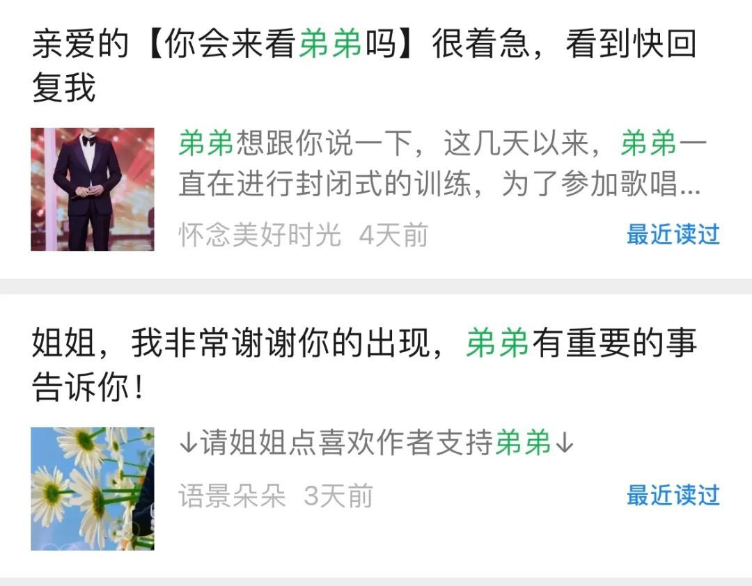 这些内容,乍一看会以为是一对姐弟正以公众号为媒介进行书信往来,但实际却并没有这么温情。这是一种并非十分新颖但确实离奇的情感诈骗方式:「弟弟式诈骗」。