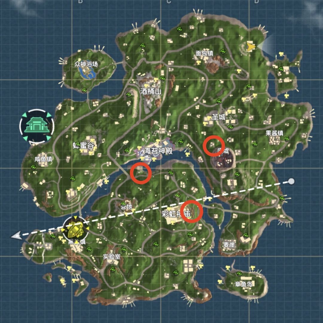 我们这套打法的核心是利用滑板的高移速和高灵活性抢夺空投及神秘道具 并在决赛圈的混战中取得主动权 所以我们先来看彩虹岛的三个滑板固定刷新点: