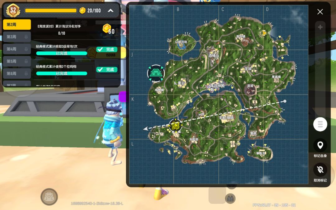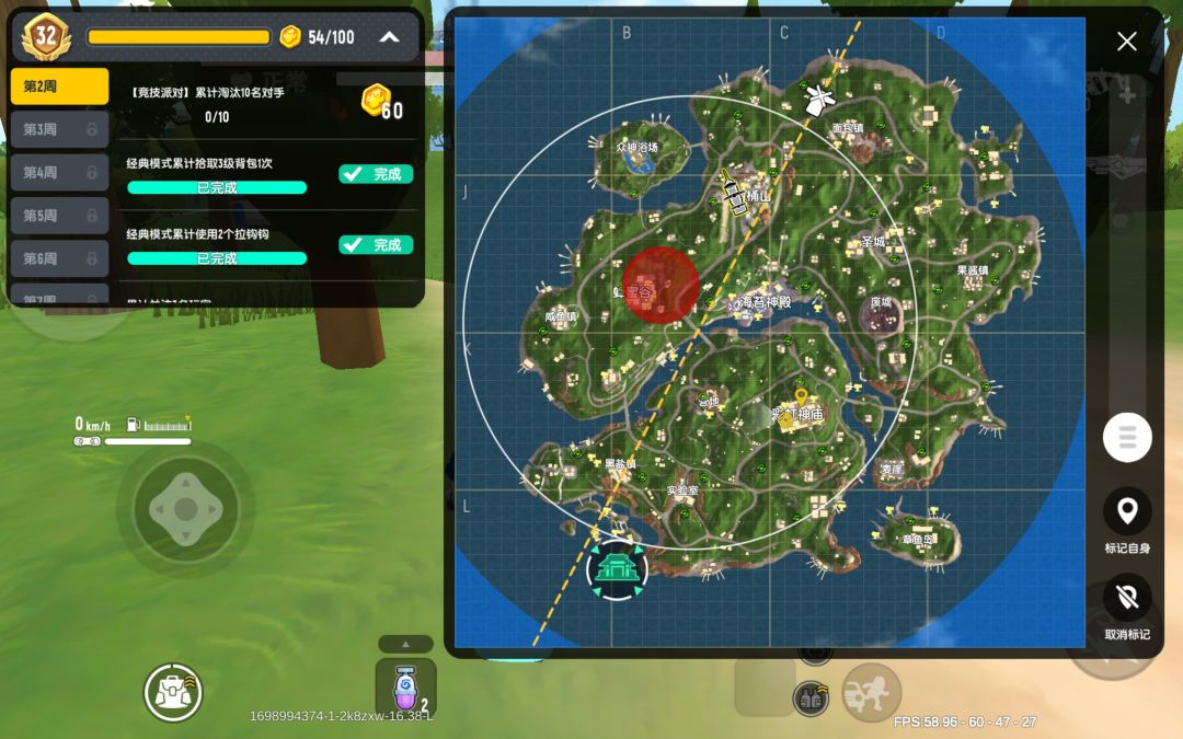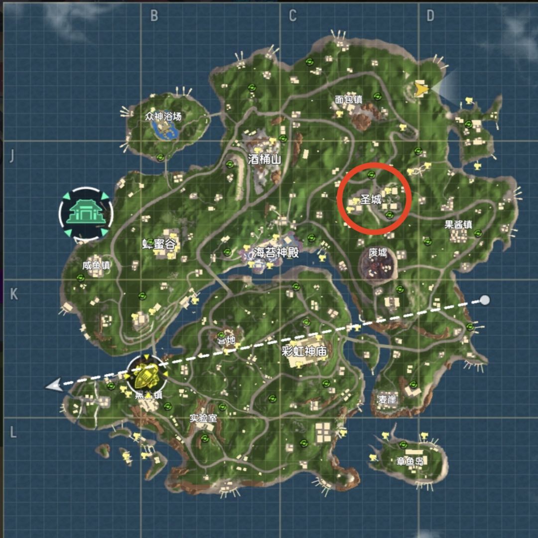 7、舔完空投后 第一个圈也缩得差不多了 静待神秘道具刷新~(注意⚠️ 不要只知道抢距离近的道具 像下图中 虽然蜂蜜谷的道具要稍微近一些 但是处在安全区中心 会有一大波敌人进行争抢 我们能抢到的概率并不大 而且如果是魔刀或者圣剑 我们也没有机会拔刀 而黑盐镇的道具虽然距离稍远一些 但处在地图边界 竞争压力会小一些 我们能抢到的概率会更大!应该选择先去黑盐镇!)