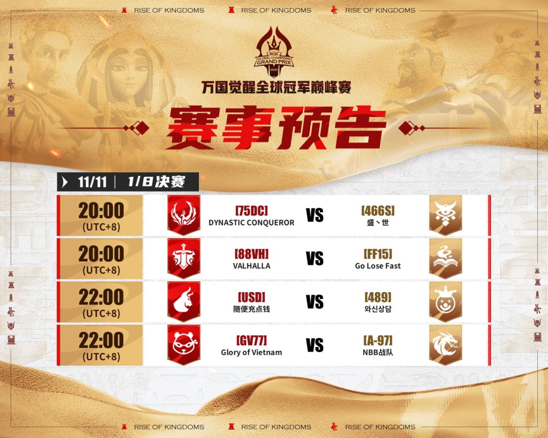 在这场激烈的比赛中,每个战队都将面临强大的对手,他们将在赛场上展现出最强的实力,为了晋级而拼尽全力!下面请看阿醒带来的1/8决赛