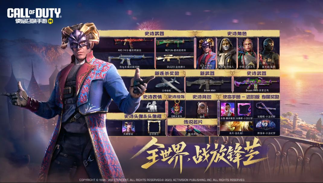 如果战士们解锁进阶版使命手册,还可以获得双节棍-小丑幻梦、降落伞-小丑幻梦、名片-金孔雀、头像框-小丑幻梦和头像-揭开面具等进阶奖励哦~