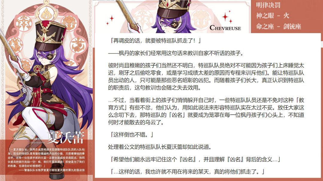 人设方面,亦如她对应的概括称号“明律决罚”。在夏沃蕾带领的特巡队中存在不少曾被她逮到的罪犯,就连莱欧斯利对她也是赞赏有加「被特巡队关照过的犯人大多挺老实的,这位队长功不可没」。曾经恶名昭彰的凶犯,现在乖乖听话的队员,也难怪枫丹人对其如此惧怕,甚至训斥小孩子都会用“等下特巡队把你抓走”的类似话语。