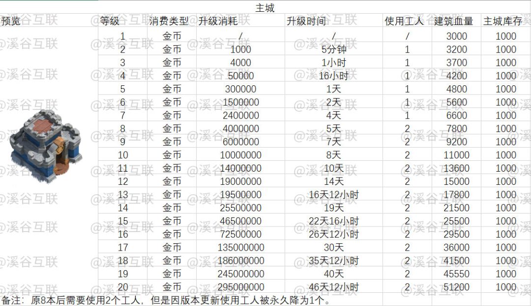 补充:溪谷玩了一年多了,当初就和开发人员说过发做一份数据升级表的,可是他貌似没时间,不方便调数据给我直接写,我只能一步一个脚印慢慢记录了,现在主城的升级数据完工了,还有很多没记录的。