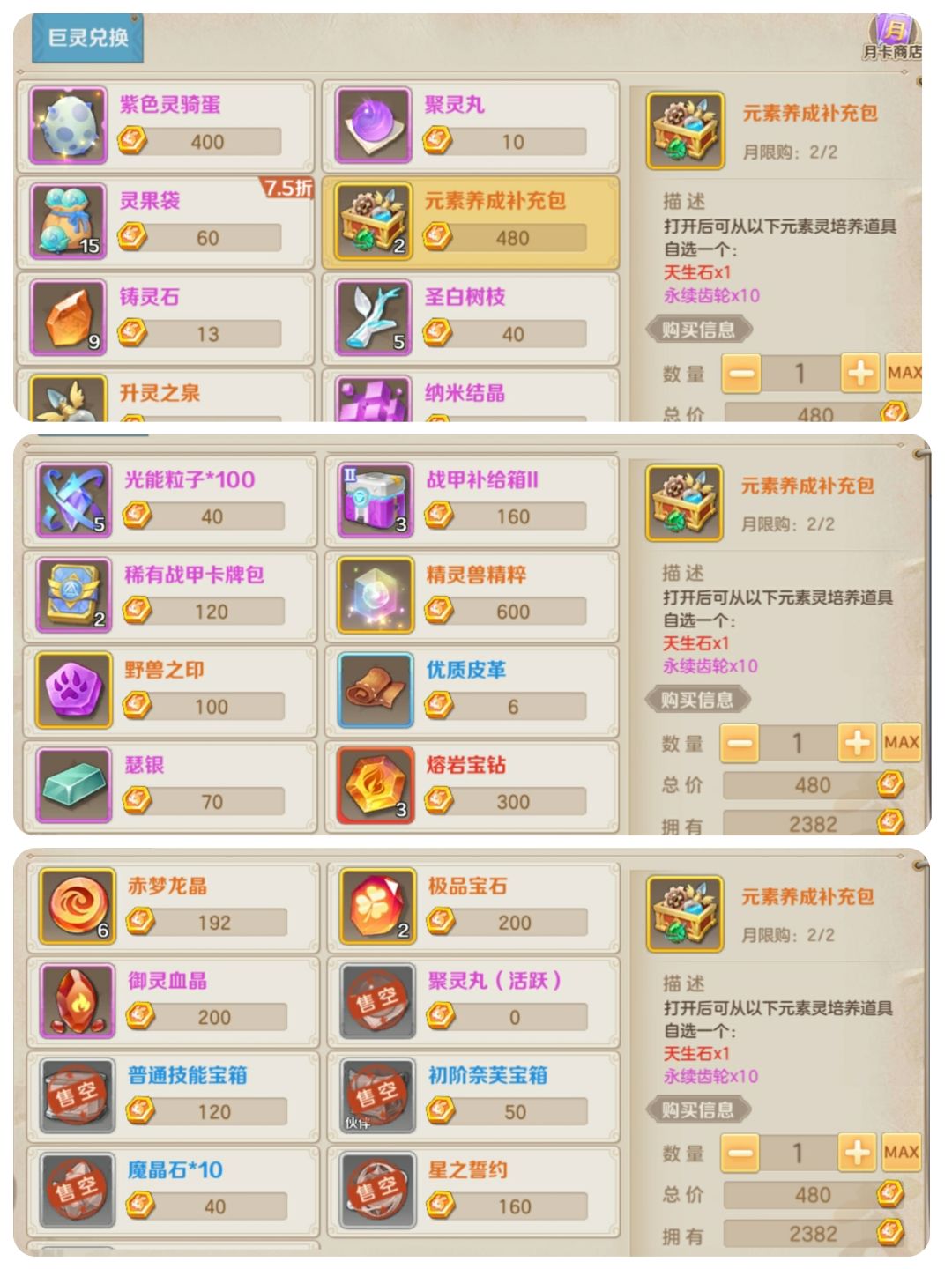 月卡商店新玩家必买精灵契约,两个月必出10个龙珠,不建议合精灵龙,拿来给其他精灵兽开天赋用合适,每周刷新一次的银币类资源全部通通买光,每天更新的星之誓约必买,周更新的720钻的史诗伙伴碎片酌情购买。
