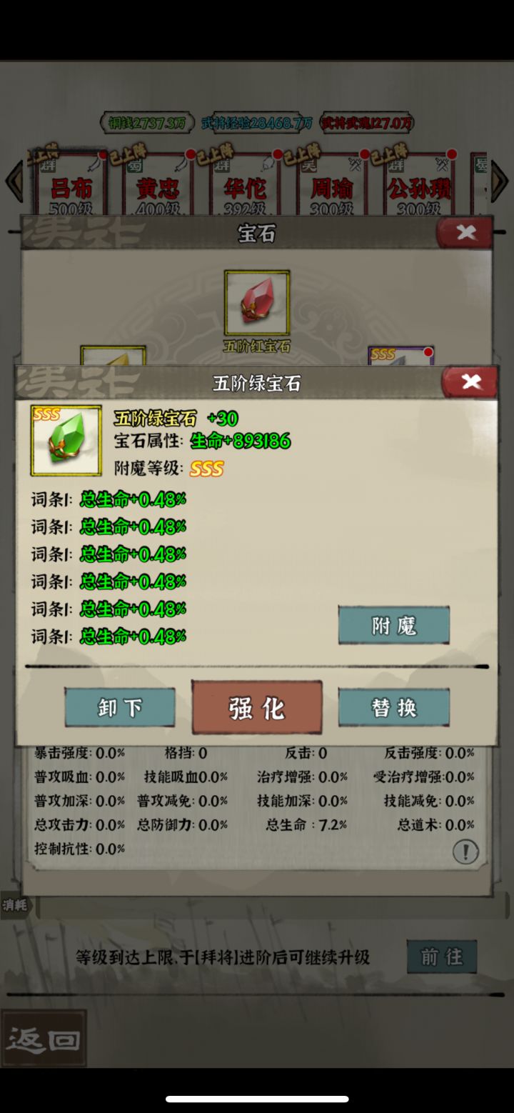 A:绿宝石,紫宝石一定要用五级,优先到30级。装备升级披风。之前升级的加攻击道术的宝石也好,装备也好,全部当狗粮转到加血量的宝石和披风上来。神器因为获取难度特别大,神器理论上最好的只有三个,左神器:落影追魂、丈八蛇矛。右神器:乌云踏雪。都是加血量的。优先升级这三个神器。