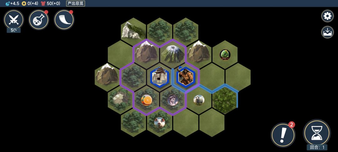 2.一格内2森林可以解锁【粮食+5】;靠山脉,可以解锁【科研+4。