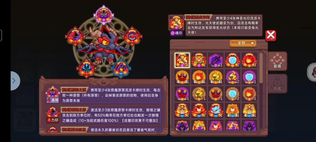 宠物补充:原罪之源(必备)其他魔印除了裁决都是提提速手段(越多变身越快)其中罪业恩赐红色一次给20个大业魂(需要最少橙色以上)恩赐位置在最后一格