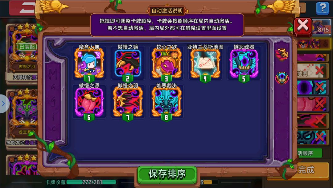 解释一下上面8张卡:1号位冷水必带加速卡牌获取2-3号位为得罪业手段(宠物没有红色恩赐魔印2个都带。新结论:镰刀变身前没蛇心快变身后比蛇心快)有红色恩赐可不带蛇心 4号位地图(这个位置不固定,看你取舍)必须选择cd+天赋伤害(满加50%)5号位魂器(必满,这个决定你罪变强度)6号位鸡心(必满,这个组合决定你暴击爆伤)7号位鸡毛(核心输出卡,必带决定你的输出频率)8号位裁决(满级后神卡,配合魔印获得大量暴击爆伤自身也有终伤加成)新增:裁决触发增伤条件为(满级)掉盾后会掉落枪(插中一把可增伤10终伤)会有buff并且只能持续五秒可无限叠加,主动技能触发的枪主要是会掉落魂,无终伤加成!