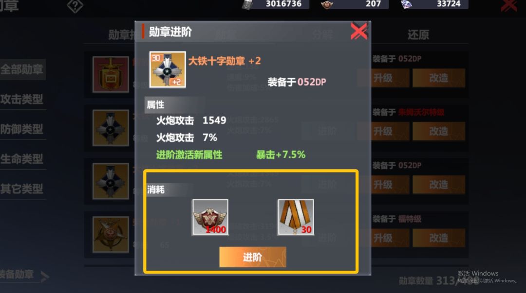 勋章进阶:需要消耗1400勋章点数和30个金丝绶带。