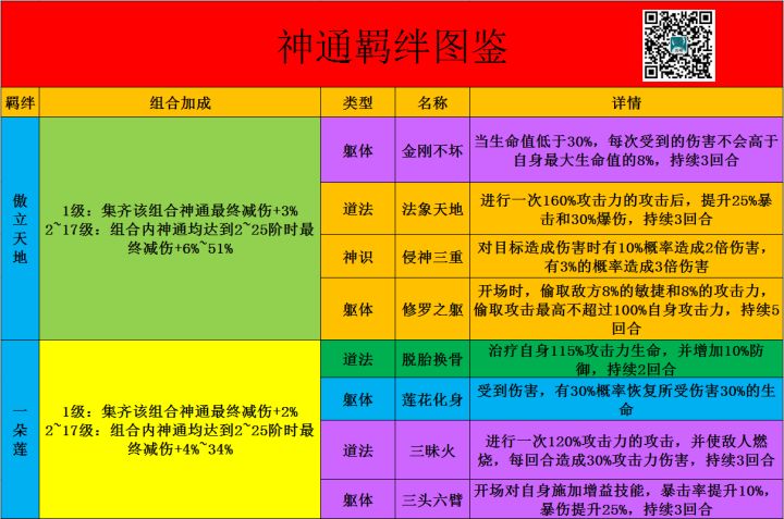 比如护体金光,治疗自身145%攻击力的生命,并获得20%最终减伤,持续到下回合结束,神通印记中,也可穿戴不同等级的增伤、减伤印记进行叠加,神通图鉴中,也可进行激活组合达到加成最终减伤、最终增伤的作用,比如傲立天地组合和齐天组合。
