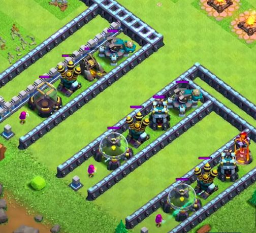 如下图,因为圣水罐和地狱塔的血量都为3300,所以弓箭手可以轻松越过10格在攻击范围外打掉地狱塔。而因为投石炮的血量为3500,所以只有隔着血量为3800的黑水罐,超级弓箭才能打掉投石炮。