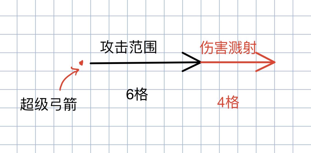 如下图,黑色箭头为超级弓箭攻击范围,而红色箭头则为溅射距离