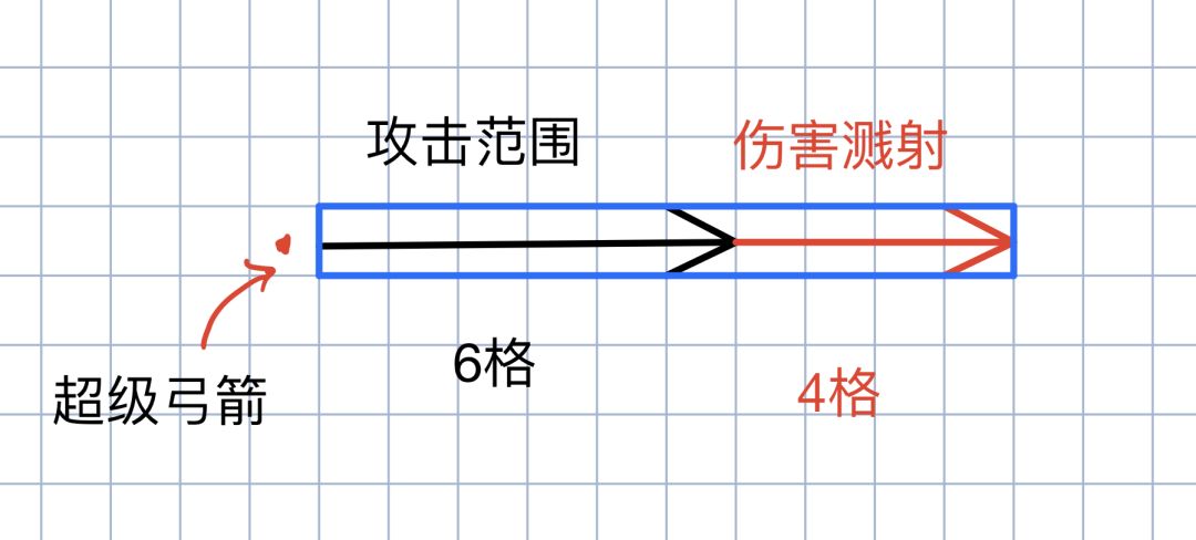 根据lz测试,超级弓箭的箭矢一旦射出,无论在攻击范围内(6格)任何一点命中目标,都会持续飞行至10格位置