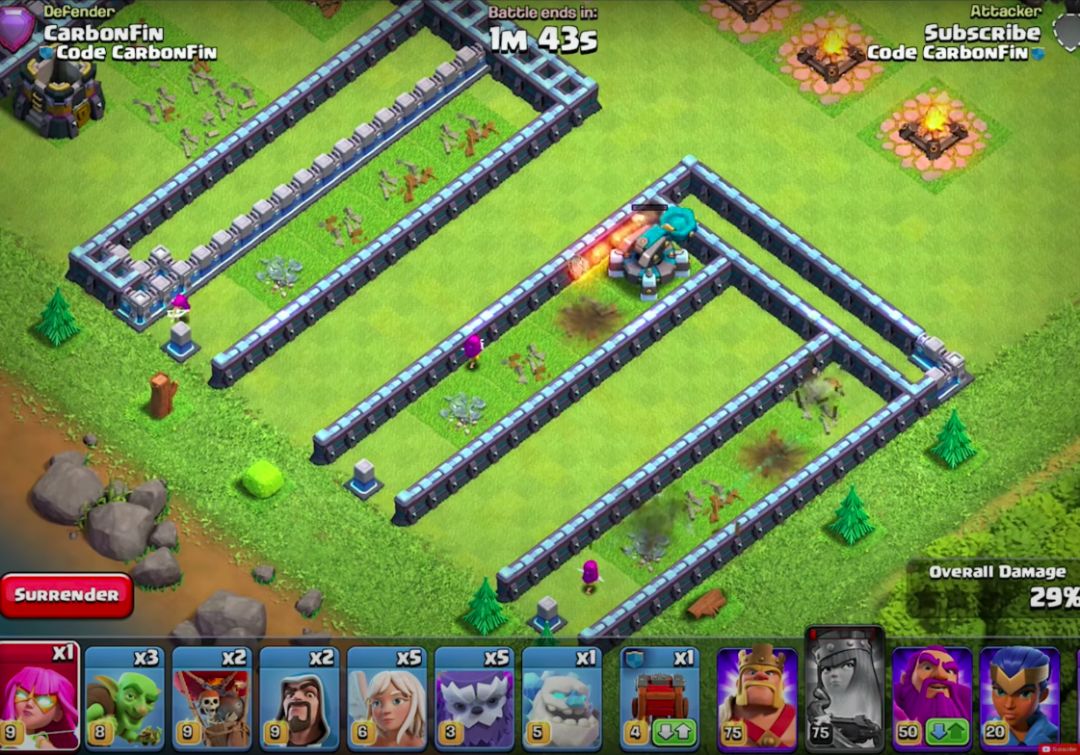 如下图,即使相隔5层城墙,超级弓箭仍能命中墙外的金库,而女王则因为距离过远选择砸墙