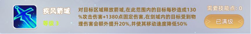 7,疾风箭域:对目标区域释放箭域,在此范围内的目标每秒造成130%攻击伤害+1380点固定伤害,在剑域内的目标 受到物理伤害会额外提升20%,并使其移动速 度降低50%,大范围群体伤害。