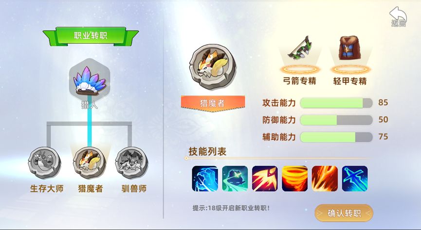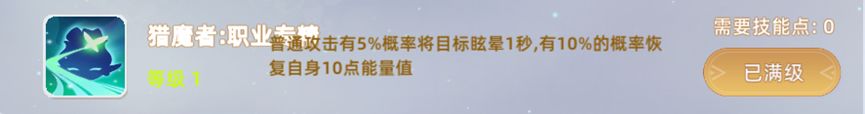 猎魔者 职业专精:普通攻击有5%概率将目标眩晕1秒,有10%的概率恢复自身10点能量值。