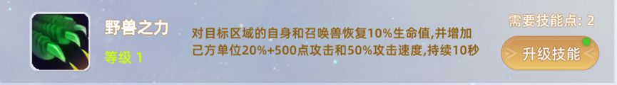 4,野兽之力:对目标区域的自身和召唤兽恢复10%生命值,并增加己方单位20%+500点攻击和50%攻击速度,持续10秒