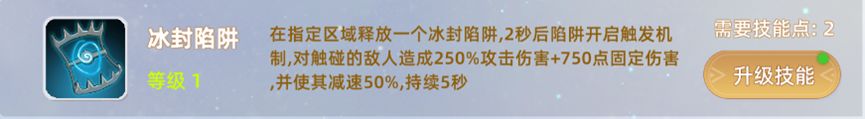 4,冰封陷阱:在指定区域释放一个冰封陷阱,2秒后陷阱开启触发机制,对触碰的敌人造成250%攻击伤害+750点固定伤害,并使其减速50%,持续5秒
