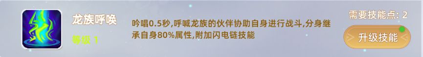 7, 龙族呼唤:吟唱0.5秒,呼喊龙族的伙伴协助自身进行战斗,分身继承自身80%属性,附加闪电链技能