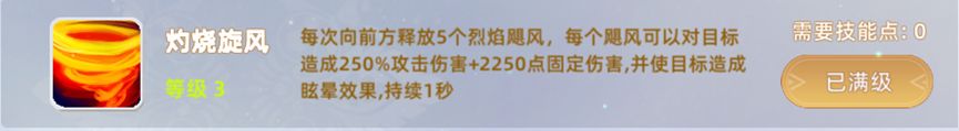 5, 灼烧旋风:向前方释放5个烈焰飓风,每个飓风可以对目标造成250%攻击伤害+2250点固定伤害,并使目标造成眩晕效果,持续1秒",群体范围输出。