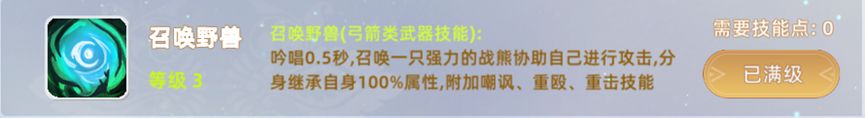 2,召唤野兽:吟唱0.5秒,召唤一只强力的战熊协助自己进行攻击,分身继承自身100%属性,附加嘲讽技能,抗伤吸引火力。