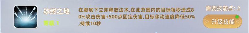 6,冰封之地:在脚底下立即释放法术,在此范围内的目标每秒造成80%攻击伤害+500点固定伤害,目标移动速度降低50%,持续10秒"