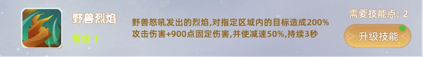 6, 野兽烈焰:野兽怒吼发出的烈焰,对指定区域内的目标造成200%攻击伤害+900点固定伤害,并使减速50%,持续3秒