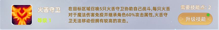 7,火舌守卫:在目标区域召唤5只火舌守卫协助自己战斗,每只火舌对于魔法伤害免疫并继承角色60%攻击属性,火舌守卫无法移动但拥有较高的攻击。