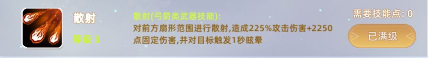 3,散射:对前方扇形范围进行散射,造成225%攻击伤害+2250点固定伤害,并对目标触发1秒眩晕,范围群体伤害控制。
