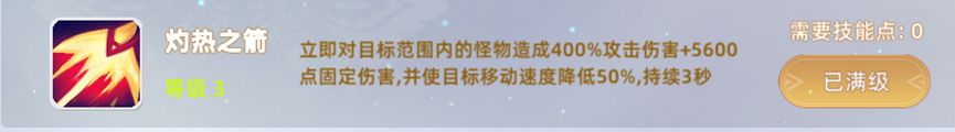 4,灼热之箭:立即对目标范围内的怪物造成400%攻击伤害+5600点固定伤害,并使目标移动速度降低50%,持续3秒,高额远程伤害。