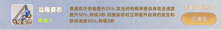 远程姿态:普通攻击伤害提升25%,攻击时有概率使自身攻击速度提升50%,持续3秒,切换姿态时立刻提升自身攻击和移动速度50%,持续3秒。
