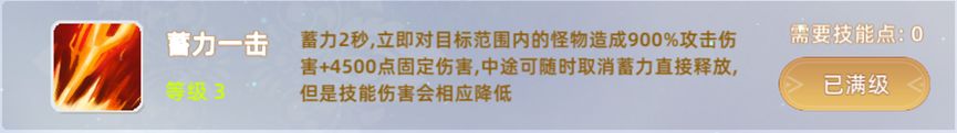 6, 蓄力一击:蓄力2秒,立即对目标范围内的怪物造成900%攻击伤害+4500点 定伤害,中途可随时取消蓄力直接释放,但是技能伤害会相应降低。