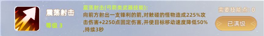 1,震荡射击:向前方射出一支锋利的箭,对触碰的怪物造成225%攻击伤害+2250点固定伤害,并使目标移动速度降低50%,持续3秒",远程消耗。