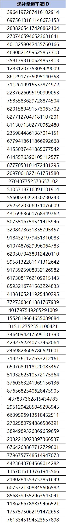 此前转区幸运车友公示名单当中,有64位未成功联系到,名单将进行顺延,以下是递补的64位幸运车友角色ID: