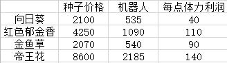 如果不种向日葵呢,2轮金鱼草,1轮郁金香,290/3=96.7,体力平均赚钱增加,但每天赚290*6=1740 减少也不多,共计体力18