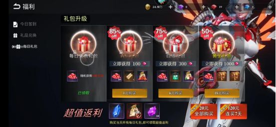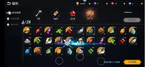 1. 右上角福利。签到每个游戏必不可少的。记得一定要晚上0.00之前签到。签到最下面是每日礼包,小氪玩家只买每日免费礼包。